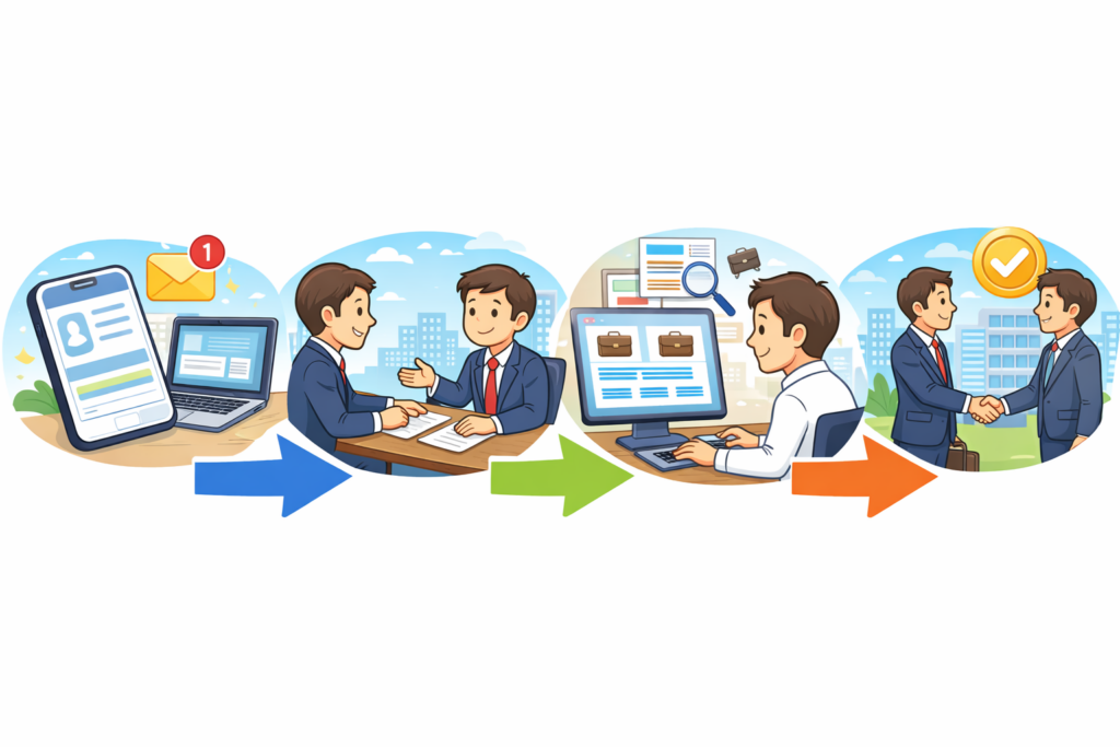 連絡が来る → 話をする → 求人を見る → 応募するか決める